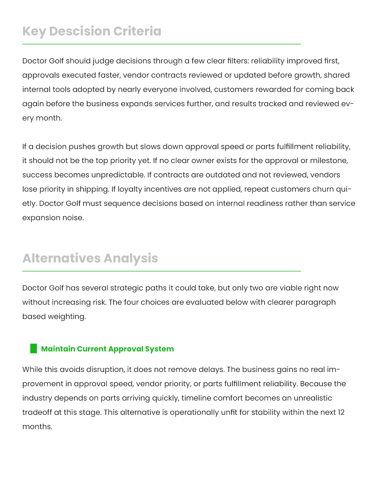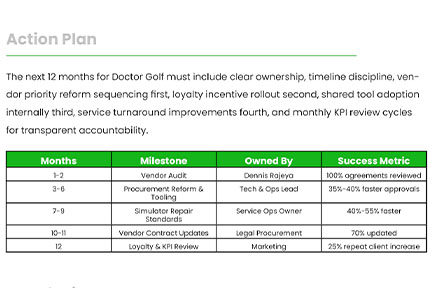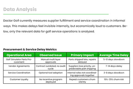 Doctor Golf is experiencing avoidable service delays driven by internal inefficiencies rather than lack of demand. Procurement approvals pass through too many manual steps, vendor agreements are outdated and rarely audited, shared internal tools are optional, and repeat customers are not formally incentivized.