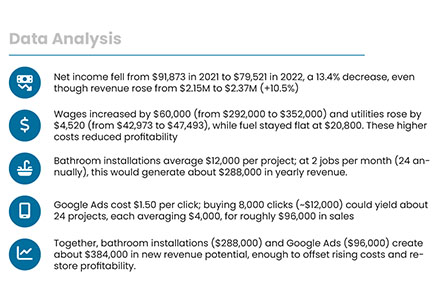 Customer inquiries revealed strong demand for custom bathroom installations, a higher-value service adjacent to LCF’s core capabilities. Financial projections showed that completing just two projects per month could generate approximately $288,000 in annual revenue, enough to meaningfully offset rising costs.